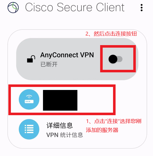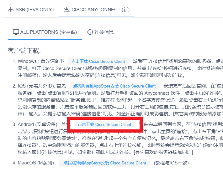 1、首先请阁下登录官网,点击“ Cisco AnyConnect (新)”,然后找到Android(安卓)点击“点击下载 Cisco Secure Client”下载客户端。