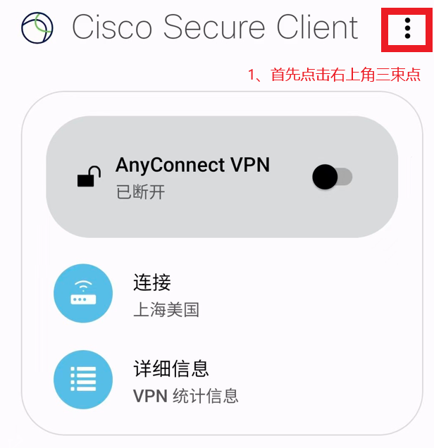 3、打开刚下载的Anyconnect软件,点击右上角三束