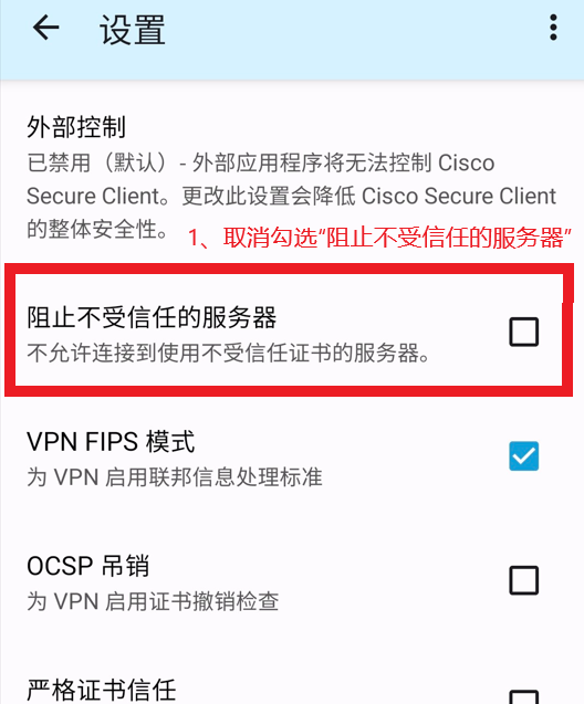 5、在设置中取消勾选“阻止不受信任的服务器”