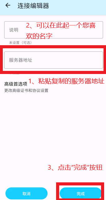 9、将您刚刚复制的内容粘贴到“服务器地址”,对于“说明”,您可以起一个您喜欢的名字,最后点击“完成”
