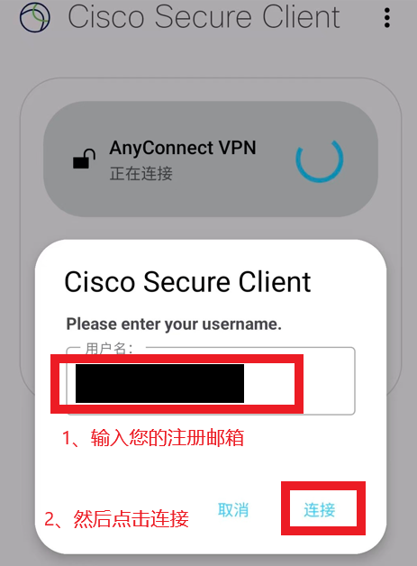 11、此时系统会提示您输入用户名(您的注册邮箱),输入后点击“连接”