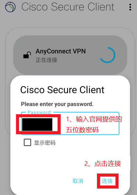 12、此时系统会提示您输入密码(官网为您生成的五位数纯数字),输入后再次点击“连接”