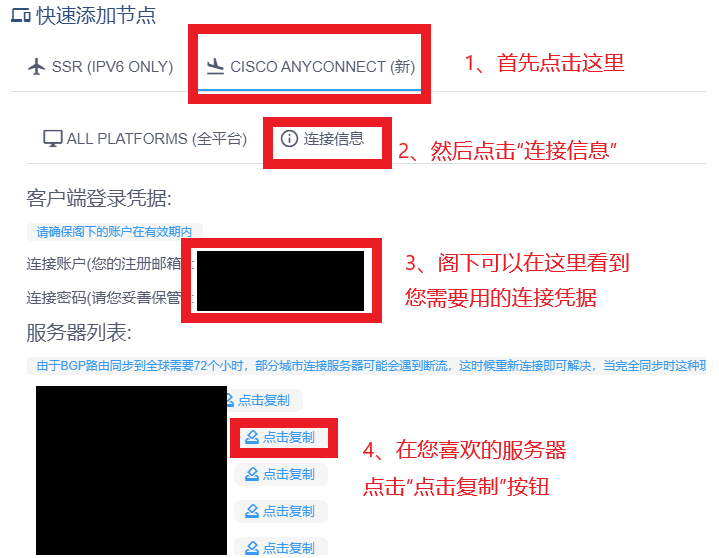 6、回到官网,然后点击“Cisco AnyConnect (新)”,再次点击“连接信息”,您可以在此页面找到您的登录凭据。然后再服务器列表选项卡找到您喜欢的服务器,并点击“点击复制”按钮进行复制